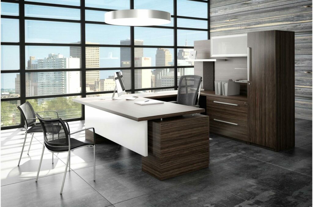 The Montreal Executive Desk, expertly crafted with a sleek laminate finish and available in two top thickness options. Choose from over 20 colors and dozens of configurations to tailor your workspace perfectly. Highlighted by a striking floating laminate modesty panel, this desk combines modern aesthetics with functional elegance. Ideal for creating a sophisticated look, especially in two-tone combinations, the Montreal Executive Desk is designed to inspire productivity and elevate the ambiance of executive offices.