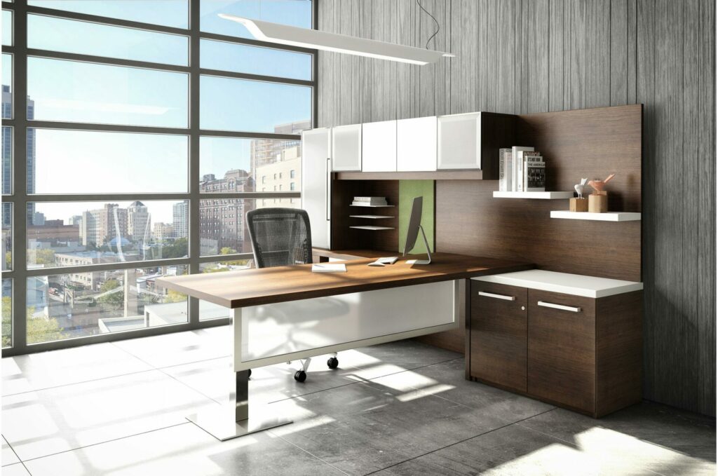 The Vancouver Executive Desk, impeccably designed with a durable laminate finish and available in two top thickness options. Choose from over 20 color options and numerous configurations to tailor your workspace perfectly. Highlighted by a sleek stainless steel square base leg and an aluminum-framed frosted acrylic modesty panel, this desk combines modern aesthetics with robust functionality. Ideal for executive environments, the Vancouver Executive Desk promises sophistication and durability, creating an impressive centerpiece for any professional office setting.
