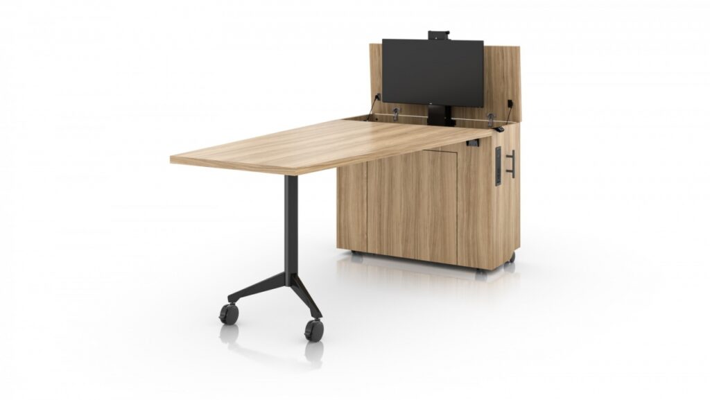 The Zori Media Center is an ideal solution for Technology-Enabled Active Learning (TEAL) environments everywhere—allowing spaces to reconfigure in seconds! Available freestanding with an integrated ganging hitch that’s attachable to any seated height table or as a complete table with a compact wedge top. With support for monitors or all-in-ones up to 32″, external power and HDMI connections, a 20′ retractable power cord, and plenty of interior space to house a PC, the Zori Media Center provides excellent functionality in a small package.