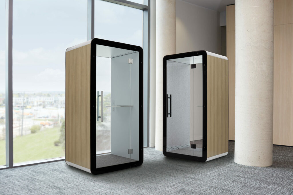 Priva acoustic pods provide a place for personal privacy, focus and online collaboration, away from the commotion of the open office. Integrated ventilation (55 cubic feet per minute) and low-voltage LED lighting are motion-sensor activated to reduce energy consumption while providing a comfortable environment for short or longer stays. The tempered glass entrance door, in combination with an optional glass back panel, reduces the sense of confinement.