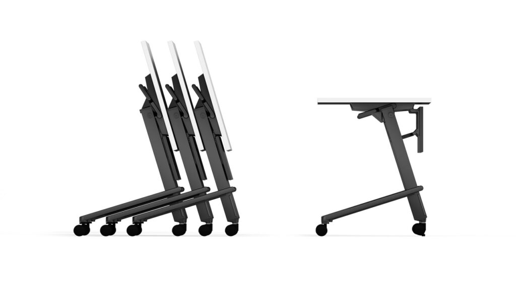 Quantum’s intuitive flip mechanism allows for one-handed operation: flip the tabletop up to engage the casters for mobility and flip it down to activate the auto-locking casters for secure placement. Optional modesty panels articulate, aligning with the table leg to preserve nesting capability. This category-leading table also features Enwork’s most dense in-line nesting capability at just 5.75 inches from table to table. Accessible bag hooks on each side provide convenient storage for personal items. A color-keyed leg guard prevents knocking when tables are placed in rows, extending the table’s lifespan.